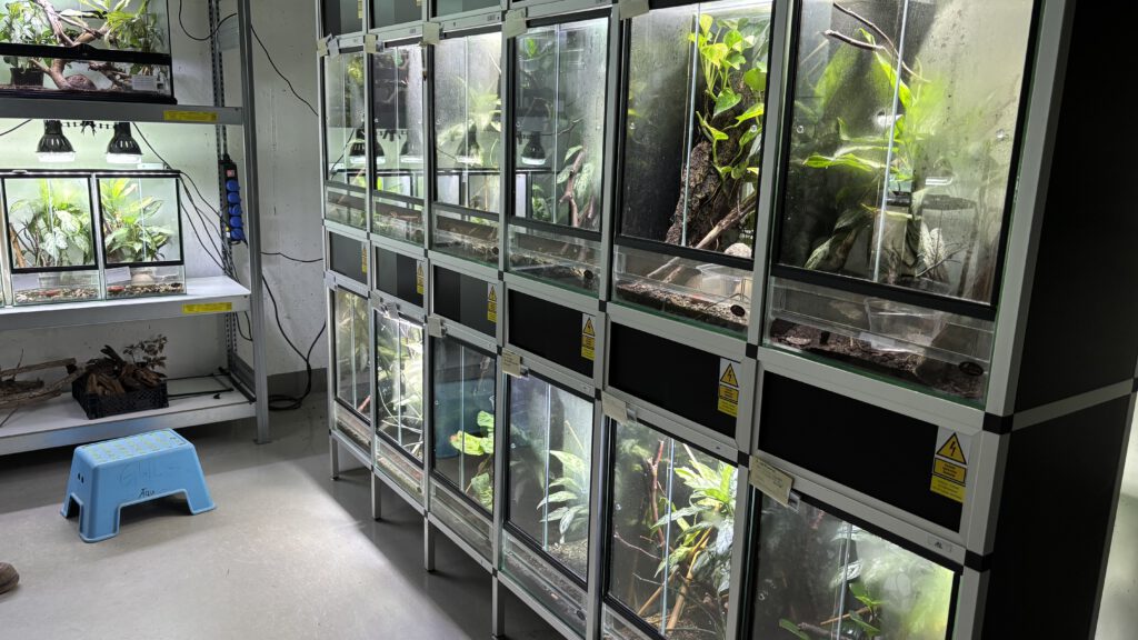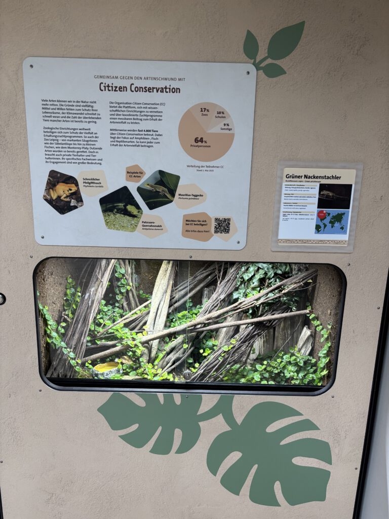 Die Nachzuchten aus dem Sommer 2025 sind in einem Gehege im neuen Reptilienhaus zu sehen. Wir konnten alle sieben Jungtiere entdecken. Wie in der Natur waren 6 davon auf den angebotenen Kletterästen. Ein Jungtier hing an der Rückwand. Da wir das neue Reptilienhaus im Zoo Leipzig direkt nach Eröffnung aufgesucht haben, waren die Beleuchtungen vermutlich auch noch nicht all zu lange an und somit konnten wir die meisten wechselwarmen Tiere unter den jeweils angebotenen Beleuchtungen sehen.
