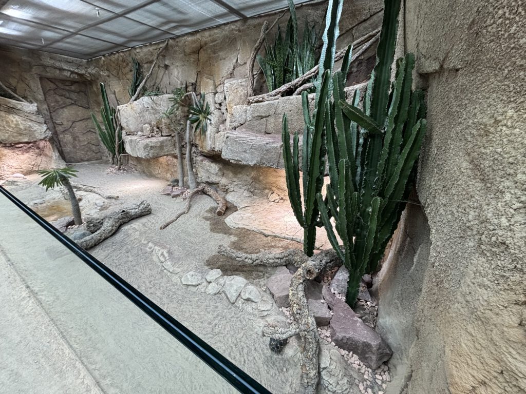 Das neue Reptilienhaus im Zoo Leipzig wurde Ende September eröffnet. Weil das neue Reptilienhaus weitestgehend dem alten und bekannten Reptilienhaus entspricht, waren wir auf die Umsetzung gespannt. Das liegt natürlich auch daran, dass der Denkmalschutz an dem Gebäude aus dem Jahr 1913 beachtet werden musste. Wie früher befindet sich auch heute wieder ein kleines Gewässer in der Mitte des Gebäudes. Zu unserem Besuchszeitpunkt war hier kein Tier zu sehen und diese Anlage nicht besetzt, da wir auch keine entsprechende Beschilderung fanden. Ich meine mich zu erinnern und hier wurden bis zum Umbau die Mississippi – Alligatoren gehalten. Bei unserem Besuch am 27.10.2025 waren die Stumpfkrokodile noch nicht in ihre neue Anlage eingezogen. In der ersten Novemberwoche sind diese aber in die gleich links am Eingang befindliche Anlage mit riesigem Wasserteil eingezogen.
