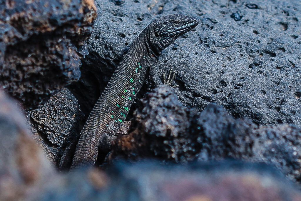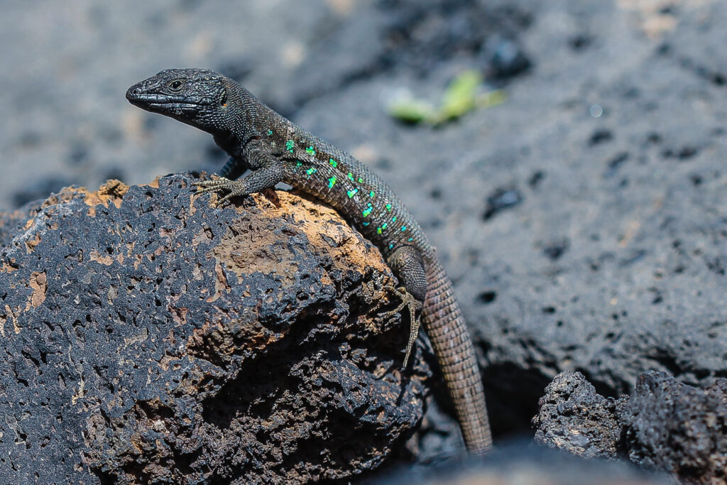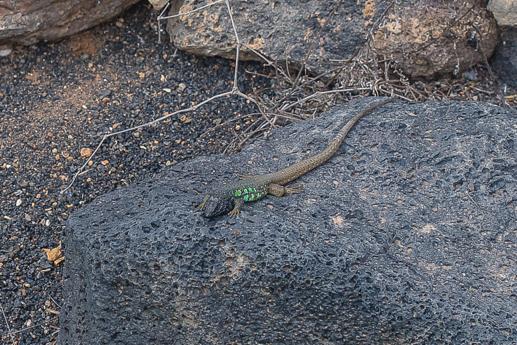 Hier konnte ich mehrere Gallotia atlantica atlantica beim Sonnenbaden beobachten. Die Kombination aus schwarzem Lavagestein und grünen Kakteen bietet perfekte Tarnung und ideale Bedingungen für Reptilien.